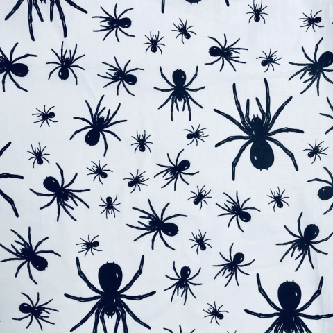 100% pamut vászon textil méteráru. 160 cm széles. Legkisebb rendelési mennyiség 1 m. 160 cm extra széles, pamutvászon textil méteráru. Finom, puha pamutvászon, kiváló ágyneműhuzat anyag. Fekete pókok minden méretben fehér alapon. Összetétel: 100% pamut