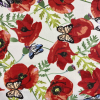 Pamut-polyeszter lakástextil méteráru. Legkisebb rendelési mennyiség 1 méter. 140 cm széles lakástextil, dekorvászon - extra minőségű termék. Szép nagy bézs pünkösdi rózsák és levelek törtfehér színű alapon. Összetétel: 48%pamut-52%polyeszter Felhaszn
