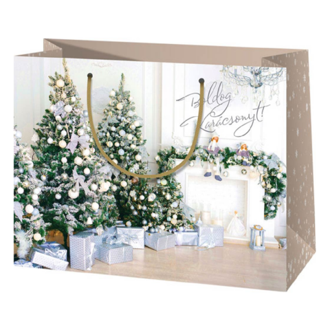 Ebben a közepes méretű ajándéktáskában az ajándékozás igazi örömmé válik! A Boldog Karácsonyt felirat azonnal az ünnepi időszakra emlékeztet, míg a vidám karácsonyfák és ajándékok mintája még inkább fokozza a karácsonyi hangulatot. Az erős szalag füleknek köszönhetően az ajándék kényelmesen és biztonságosan szállítható. Az erősített