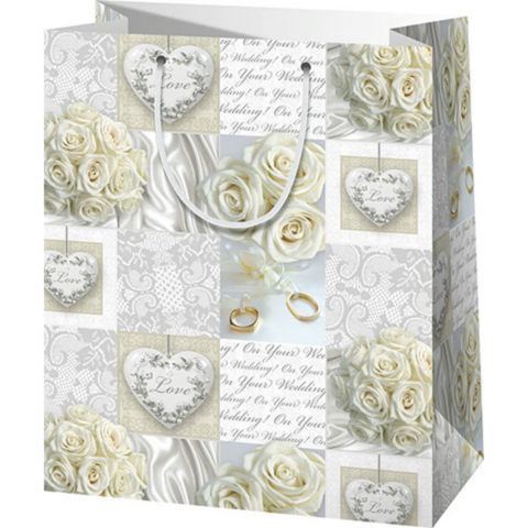 Egy kiváló minőségű, fényes lakkozott felülettel rendelkező ajándéktáskát szerezhetsz be amely hófehér virágmintázattal rendelkezik és kiválóan alkalmas esküvői ajándékok csomagolására. Az ajándéktáska masszív fogantyúkkal rendelkezik amelynek használatával könnyedén szállíthatod az ajándékot és nyújthatod át az ünnepelt számára.