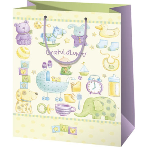 Babaváró bulikra az ajándékok átadására remek választás ez a különleges "Gratulálunk!" felirattal ellátott ajándéktáska. A Cardex kiváló minőségű ajándéktáskái erős zsinór fülekkel és erősített talprésszel készülnek, hogy a nehezebb ajándékokat is könnyen és biztonságosan lehessen bennük szállítani. A táska felülete laminálássa