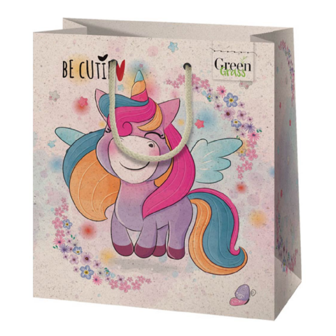 Ez a közepes méretű Green Grass ajándéktáska a mesebeli lények és a természet szerelmesei számára kínál egyedülálló megjelenést. Az unikornisos minta a mágia, ártatlanság és a szépség szimbólumaként jelenik meg, így az ajándéktáska ideális választás mindenki számára, aki hisz a csodákban. A 18 x 10 x 23 cm-es méretben készült tás
