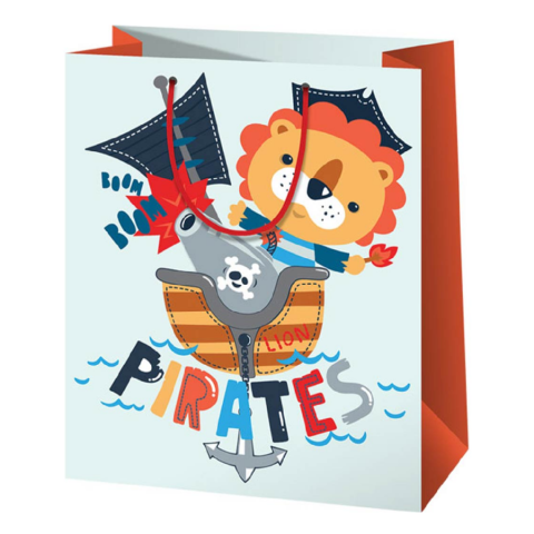 Éljen az erős oroszlán kalózoknak szentelt ajándéktáskával! Ezen közepes méretű, 18x23x10 cm-es táska azonnal elvarázsolja majd az ünneplőt. A táska külsejét egy merész oroszlán kalóz díszíti, aki biztosan mosolyt csal a megajándékozott arcára. A táskát kiváló minőségű, fényes laminált papírból készítették, amely nem csak kiválóan mutat, hanem