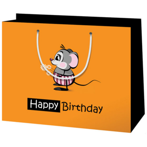 Egy nagyon aranyos ajándékszatyorban adhatod át az ünnepelt részére ajándékodat, mely igazán egyedi megjelenést kapott. A táska ugyanis fekete- narancssárga színekben pompázik, elején pedig egy imádnivaló kisegér látható, virágokkal a kezében, alatta pedig a Boldog Születésnapot felirat látható. Méretének köszönhetően kényelmesen elfér majd