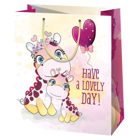 Tedd az ajándékodat ebbe az elbűvölő közepes méretű ajándéktáskába, és garantáltan mosolyt csalsz az ajándékozott arcára! A "Have a lovely day" felirat pozitív üzenetet közvetít, ami kiválóan illik bármilyen örömünnepi alkalomhoz, de akár egy normális napot is szebbé tehetsz ezzel az ajándéktáskával. A táska cuki állatos díszítéssel v
