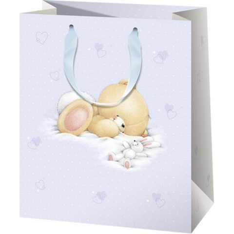 Ezen a rendkívül dekoratív, halvány kék ajándéktáskán egy plüss maci és kis nyuszija láthatók, amint épp a puha takarón pihennek. A kiváló minőségű és egyben igazán elegáns ajándéktáska kék szalagfüllel is ellátott, ami segíti annak és a benne rejlő meglepetésnek a kényelmes hordozását, így az ünnepelt egy stílusos kiegészítőben kapja azt meg. Szülinapokr