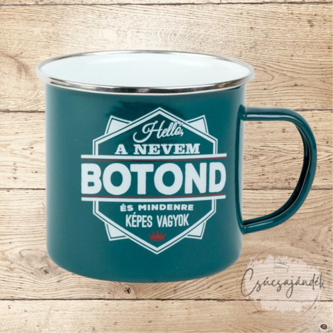 Neves fémbögre férfiaknak Helló, a nevem Botond és mindenre képes vagyok! Botik bögréje! Névnapra, szülinapra tökéletes választás. Fémből készült, retro, füles bögre. Sötétzöld alapon fehér felirat elől és hátul: Helló, a nevem Botond és mindenre képes