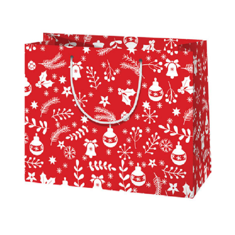A karácsonyi ajándékok átadása sokkal meghittebb és sokkal nagyobb meglepetéssel jár, ha gondoskodunk egy megfelelő csomagolásról vagy ajándék tasakról, és ez a piros alapszínű, de fehér karácsonyi mintákkal díszített tasak remek választás lehet. A közepes méretű, fekvő kialakítású ajándéktáska kiváló minőségű, telített színekkel k