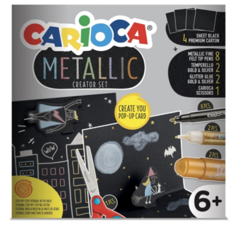 Kicsiknek és nagyoknak egyaránt remek választás ez a 17db-os Carioca Metallic kreatív szett, melyben 17 hasznos és izgalmas kiegészítő található. A szett a Carioca Metallic termékcsaládjából tartalmaz eszközöket, melyek segítségével a csomagban található 4db fekete lapok lélegzetelállító alkotásokká varázsolhatók. A szettben található 8db Metallic filctoll, 2db Tempere