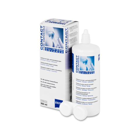 A Zeiss All In One Advance (360 ml) univerzális ápolószer hatékonyan megtisztítja, regenerálja és eltávolítja a szennyeződéseket minden lágy kontaktlencséről.