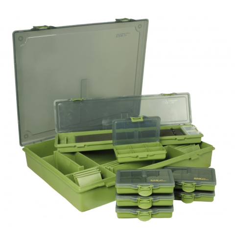 Nagyméretű, univerzális szerelékes doboz, különálló egységekkel. A nyolc kisebb doboz kiválóan alkalmas minden kisméretű kütyü tárolására, a horgoktól a forgókig. Fix falainak köszönhetően stabilan tartják a külön szelektált kiegészítőinket. A tárolódoboz rekeszeit tetszés szerint tudjuk beállítani a kívánt méretre.