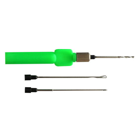 Kisméretű, könnyen és gyorsan használható. Három különböző fejjel szerelhető. Tartalmaz egy csalifúrót a keményebb csalik előkészítéséhez, kapcsos és hornyos fűzőtűket a felszereléshez.