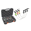 A kiváló minőségű, három különböző színű swinger láncos változatát elegáns, és egyben tökéletes védelmet nyújtó kofferben kínáljuk. A szettben található swingerek sárga, piros és zöld fényt bocsátanak ki, jól jelzik a húzós és az ejtős kapásokat egyaránt. Hibátlan, megbízható működésével a modern rádiós kapásjelzők nélkülözhetetlen egységeként funkcionál.