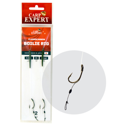 Carp Expert Fluorocarbon Boilie rig előkötött pontyozó előke A CARP EXPERT FLUOROCARBON BOILIE RIG nagy segítség lehet, azoknak a pontyhorgászoknak, akik nem szeretnek a kötögetéssel bíbelődni! A horogelőke strapabíró, 0,40-es vastagságú fluorocarbon zsinórból lett megkötve, a biztos akadásért pedig a 4-es méretű szakállas horog felel. Rövid hosszából adódóan nem csak behúzós, hanem dobós pecára egyaránt alkalmas. Ennél a kötési módszernél könnyedén tu
