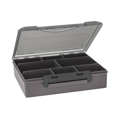 A felszerelés jól rendszerezett tárolására kialakított, 23 x 20 x 6 cm-es doboz, melynek belső osztása igény szerint alakítható. Az apróbb kiegészítők, horgok, kapcsok és forgók elhelyezésére 4 darab 10 x 6.5 x 2.5 cm-es doboz áll rendelkezésünkre, melyek három, négy hat, illetve nyolc fakkosak. Mind a nagyobb, mind a kisméretű dobozokra strapabíró csat került, mellyel tökéletesen zárhatóak. Anyaga masszív, az áttetsző fedélre praktikus méretskála került.
