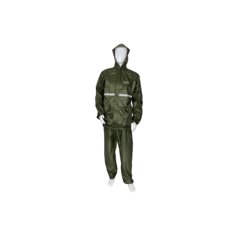 Ellenálló, gumírozott anyagból készült kétrészes esőruha. A felsőrész csuklója gumírozott, megakadályozza az eső bejutását. A kapucni a nyakrésznél található madzaggal összehúzható, a nadrág dereka gumírozott. A cipzár masszív kialakítású, összehúzás után patentokkal ellátott résszel teljes hosszában elrejthető, így kizárt annak a lehetősége, hogy a cipzáron keresztül nedvesség jusson a ruha alá. A felsőrészre két nagyméretű zseb és elöl hát