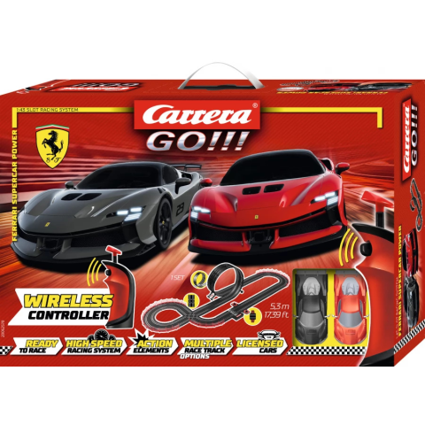 5,3m hosszú Carrera GO!!! pálya készlet 2 darab Ferrari SF-90 XX Stradale sportkocsival. Jellemzők: - Pálya hossza: 5,3 m - Mérete összeszerelés után: 180 x 75 cm Tartozékok: - 1x Ferrari SF-9...