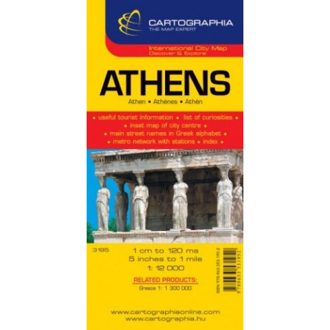 Athén várostérképe, négynyelvű jelmagyarázattal, metrótérképpel és névmutatóval. A térképen a főbb utcák neve latin és görög betűkkel is fel van tüntetve. (Méretarány: 1:12000)