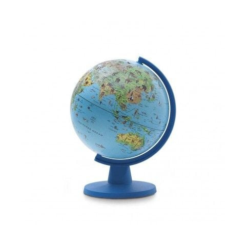 16 cm átmérőjű, magyar nyelvű gyermek földgömb, állatvilág tematikával. Szépen illusztrált, igényes kivitelű földgömb. Nem világító.