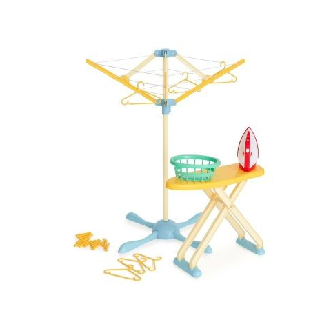 Nagymosás játékszett segíteni vágyó gyerekeknek. A szett tartalma: 1 db összecsukható vasalódeszka, 1 db ruhaszárító állvány, 1 db játékvasaló, 1 db szennyeskosár, ruhacsipeszek, fogasok. A játék strapabíró anyagokból készült, a vasalódeszka összecsukható. Csomagolás mérete: 41 x 30 x 9 cm