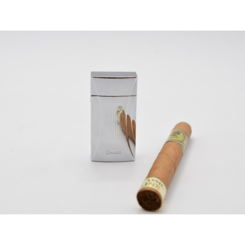 Caseti Paris Chamonix fényes króm színű csíkos mintás, szúró lánggal égő szivar öngyújtó. Piezo elven működő, az alján újratölthető állítható láng mérettel és kihajtható szivarvágóval. Az ezüst színű öngyújtó elején Caseti márkajelzéssel. A kihajtható szivar vágó egy praktikus kiegészítő minden szivaros számára, bárhol is vagyunk kéznél van minden öngyújtó és a szivarvágó és mindez egyben!Bársonnyal bélelt kék színű díszdobozban kül