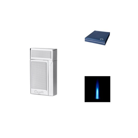Caseti Soleil Caree mintás króm színű Jet szivaröngyújtó. A szúrólángos szivargyújtó öngyújtó gázzal újratölthető és állítható lángméretű. Az apró négyzet mintás elegáns szivaros öngyújtó elején Caseti márkajelzéssel.Bársonnyal bélelt kék színű díszdobozban - gyönyörű ajándék.Méret: 78mm x 33mmSúlya: 43gramm