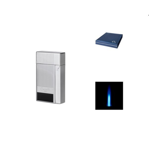 Caseti Soleil csíkos mintás króm és fekete színű szúrólángos vihargyújtó. A Jet lángos szivaros öngyújtó gázzal újratölthető és állítható lángméretű. A csíkminta egy nagyon elegáns megjelenést garantál ennek az öngyújtónak, az elején Caseti márkajelzéssel.Bársonnyal bélelt kék színű ajándék dobozban.Méret: 78mm x 33mmSúlya: 43gramm