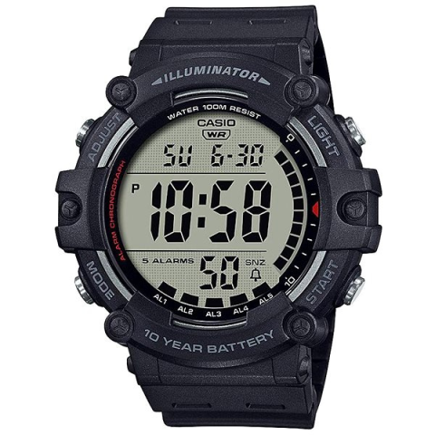 Karóra férfiaknak - digitális idő megjelenítés, óramű típusa quartz, kerek számlap, ébresztőóra, dátum, kettős idő, megvilágítás, stopper és gombhang, sportos, arab indexek, műanyag számlap, 100 m (10 ATM) vízhatlanság, a tok anyaga szintetikus gyanta, a tok színe fekete, a szíj anyaga gyanta, a szíj színe fekete A nagyszerű CASIO AE-1500WH-1AVEF férfiaknak karóra alkalmas mindennapi viseletre. Az alapját egy 51 mm szélességű kerek számlap alkotja. A hatékony