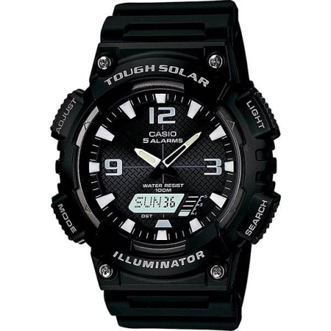 Karóra férfiaknak - analóg idő megjelenítés, napelemes, kerek számlap, dátum, a hét napja, kronográf, alacsony elemfeszültség jelzése, naptár, megvilágítás, stopper és világidők, Casio Collection sorozat, sportos, arab indexek, műanyag számlap, vízálló, a tok anyaga szintetikus gyanta, a tok színe fekete, a szíj anyaga gyanta, a szíj színe fekete, 14 - 21,5 cm csuklóméretre A Casio AQ S810W-1A férfi karóra egyszerre praktikus és precízen kidolgozott. Az óra ta