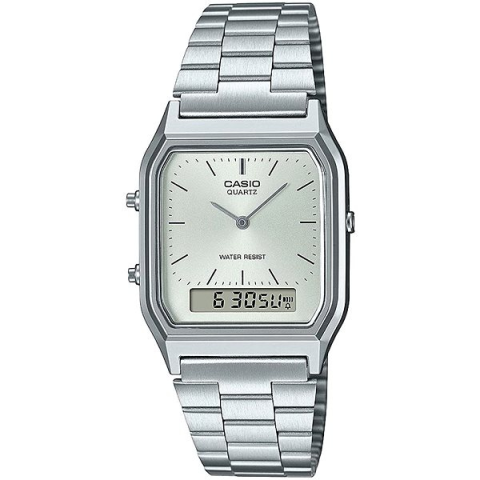 Karóra férfiaknak - kombinált idő megjelenítés, óramű típusa quartz, szögletes számlap, ébresztőóra és stopper, Casio Collection sorozat, elegáns, számozás nélküli, műanyag számlap, vízálló, a tok anyaga műanyag, a tok színe ezüst, a szíj anyaga acél, a szíj színe ezüst, cserélhető szíjjal A kiváló minőségű CASIO Collection AQ-230A-7AMQYES férfiaknak karóra remek választás a mindennapkora. Az alapját egy 27,8 mm-es szögletes számlap alkotja. Az eff