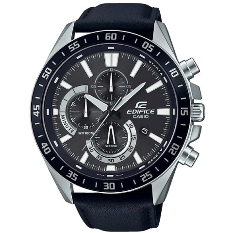 Karóra férfiaknak - analóg idő megjelenítés, óramű típusa quartz, kerek számlap, dátum és stopper, Casio Edifice sorozat, elegáns, arab indexek, ásványi számlap, 100 m (10 ATM) vízhatlanság, a tok anyaga acél, a tok színe ezüst, a szíj anyaga bőr, a szíj színe fekete A minőségi CASIO EDIFICE EFV-620L-1AVUEF férfiaknak karóra jól jön a mindennapok során. Az alapját egy 50,5 mm-es kerek számlap képezi. A Quartz technológia hosszú élettartamot és precíz időm
