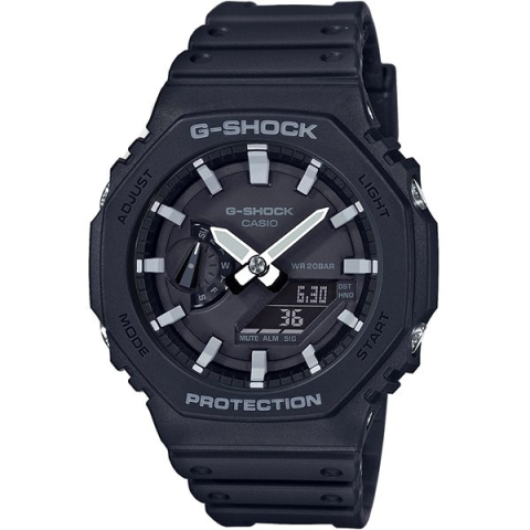 Karóra férfiaknak - kombinált idő megjelenítés, óramű típusa quartz, szögletes számlap, ébresztőóra, dátum, kettős idő, megvilágítás és stopper, Casio G-Shock sorozat, sportos, számozás nélküli, ásványi számlap, 200 m (20 ATM) vízhatlanság, a tok anyaga műanyag, a tok színe fekete, a szíj anyaga műanyag, a szíj színe fekete A klassz CASIO G-SHOCK GA-2100-1AER férfiaknak karóra nagyszerű viselet hétköznap és ünnepnap is. Az alapját egy 45,4 mm széles s