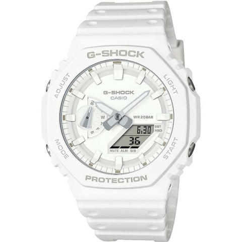 Karóra férfiaknak - kombinált idő megjelenítés, óramű típusa quartz, szögletes számlap, ébresztőóra, megvilágítás és stopper, Casio G-Shock sorozat, sportos, számozás nélküli, ásványi számlap, 200 m (20 ATM) vízhatlanság, a tok anyaga műanyag, a tok színe fehér, a szíj anyaga műanyag, a szíj színe fehér, cserélhető szíjjal A kiváló minőségű CASIO G-SHOCK GA-2100-7A7ER férfiaknak karóra jó szolgálatot tesz a mindennapokban. Az alapját egy 45,4 mm-es