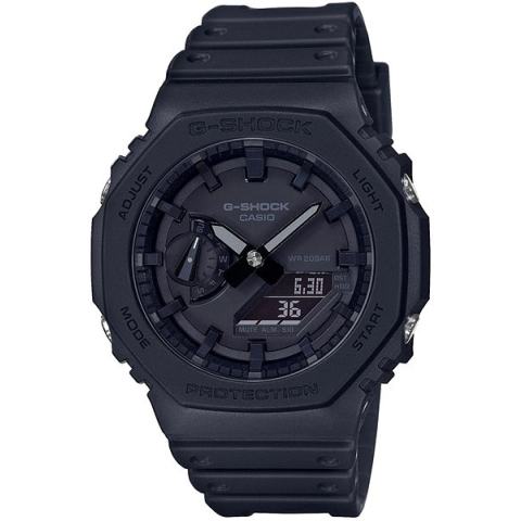 Karóra férfiaknak - kombinált idő megjelenítés, óramű típusa quartz, kerek számlap, ébresztőóra, dátum és stopper, Casio G-Shock sorozat, sportos, számozás nélküli, ásványi számlap, 200 m (20 ATM) vízhatlanság, a tok anyaga műanyag, a tok színe fekete, a szíj anyaga műanyag, a szíj színe fekete Casio GA-2100-1A1ER férfi karóraKvarc szerkezet / Ikonikus G-Shock kialakítás / Nagyfokú tartósságA stílusos Casio GA-2100-1AER férfi karóra a népszerű és bevál