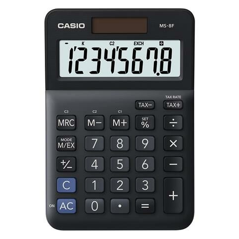 A Számológép, asztali, 8 számjegy, CASIO MS-8 F, fekete (GCMS8F) Kiváló felszereltséggel és stílusos kialakítással rendelkező számológép irodai használatra -nagy döntött kijelző -helyiérték elválasztó -műveletszimbólumok kijelzése -ÁFA számítás -va