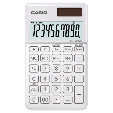 ZSEBSZÁMOLÓGÉP 10 DIGIT CASIO SL 1000 SC FEHÉR 10 számjegyű nagyméretű LCD kijelzővel funkció megjelenítéssel, professzionális százalékszámítás, nyereségszámítás a % gomb segítségével, ÁFA számítás, három számjegyenként szeparátor vessző, gyökvonás, +