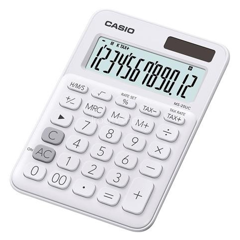 Számológép, asztali, 12 számjegy, CASIO MS 20UC, fehér CASIO számológép trendy colours sorozat, fehér színben. -12 számjegyű -nagy döntött kijelző -ÁFA számítás, árrés számítás -elem+napelem -utolsó szám javítása -gyökvonás, %, 00, +/- -időszámolás -