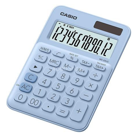 Számológép, asztali, 12 számjegy, CASIO MS 20UC, világoskék CASIO számológép trendy colours sorozat, kék színű 12 számjegyű, Nagy döntött kijelző ÁFA számítás, árrés számítás, elem+napelem, utolsó szám javítása, gyökvonás, %, 00, +/-, időszámolás,