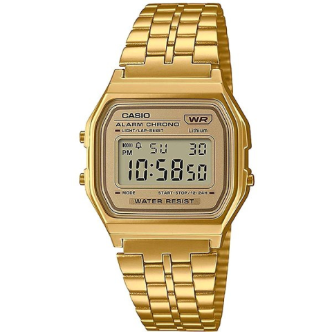 Karóra uniszex kivitelben - digitális idő megjelenítés, óramű típusa quartz, szögletes számlap, ébresztőóra, megvilágítás és stopper, Casio Vintage sorozat, elegáns, arab indexek, műanyag számlap, vízálló, a tok anyaga műanyag, a tok színe arany, a szíj anyaga acél, a szíj színe arany, 15 - 20,5 cm csuklóméretre, cserélhető szíjjal A klassz CASIO VINTAGE A158WETG-9AEF uniszex kivitelben karóra alkalmas mindennapi viseletre. Az alapját egy 36,8 mm széles szög
