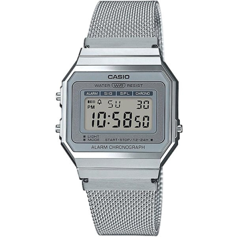 Karóra nőknek - digitális idő megjelenítés, óramű típusa quartz, szögletes számlap, ébresztőóra, dátum, megvilágítás és stopper, Casio Vintage sorozat, elegáns, arab indexek, ásványi számlap, vízálló, a tok anyaga műanyag, a tok színe ezüst, a szíj anyaga acél, a szíj színe ezüst A kitűnő CASIO VINTAGE A700WEM-7AEF nőknek karóra nagyszerű viselet hétköznap és ünnepnap is. Az alapját egy 37 mm átmérőjű szögletes számlap képezi. A Quartz technoló