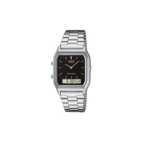 Karóra férfiaknak - analóg idő megjelenítés, óramű típusa quartz, szögletes számlap, ébresztőóra, dátum, kettős idő és stopper, Casio Retro sorozat, retró, számozás nélküli, műanyag számlap, vízálló, a tok anyaga acél, a tok színe ezüst, a szíj anyaga acél, a szíj színe ezüst A klassz CASIO VINTAGE AQ-230A-1DMQQYES férfiaknak karóra remek választás a mindennapkora. Az alapját egy 27,8 mm széles szögletes számlap alkotja. A Quartz technológia hosszú