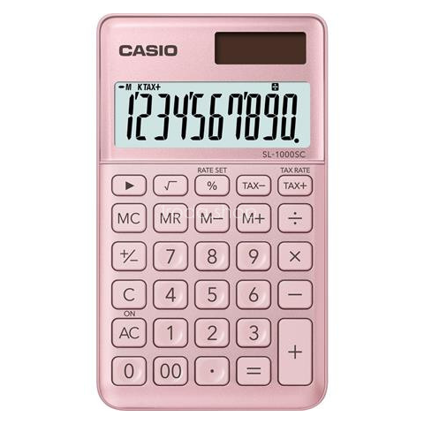 Zsebszámológép, 10 számjegy, CASIO SL 1000, világos rózsaszín - nagy kijelző - kétféle áramforrás (elem + napelem) - trendy colours sorozat - %, +/- gombok - ÁFA számítás - árrés számítás - idővel kapcsolatos számítások - „00” gomb - utolsó sz