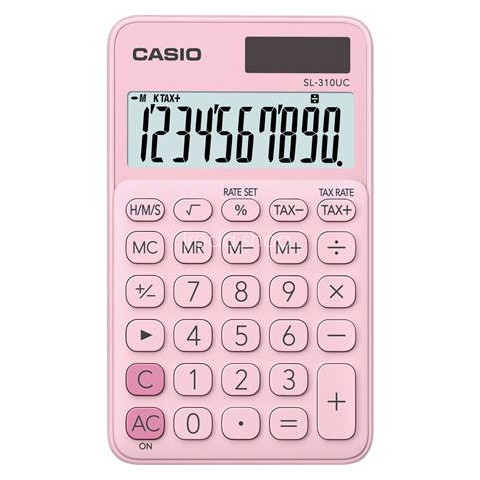 Zsebszámológép, 10 számjegy, CASIO SL 310K, világos rózsaszín - nagy kijelző - kétféle áramforrás (elem + napelem) - trendy colours sorozat - %, +/- gombok - ÁFA számítás - árrés számítás - memória - utolsó számjegy javítása - gyökvonás - id