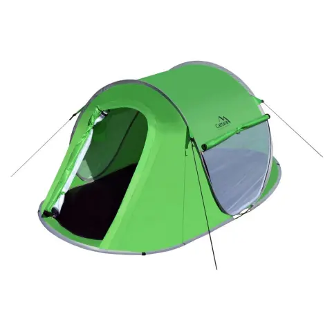 Önfelállító egyrétegű sátor 2 személy számára, fő bejárat kétoldalas cipzárral, szúnyogháló rovarok ellen, oldalsó cipzáras ablakok a légáramlásért, ragasztott varratok, összecsomagolt méretek 75 x 9 cm, zöld. Menjen akár kempingezni vagy kirándulni a