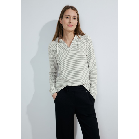 Cecil Női Póló 321004-23474. Színe: vanilla white Art. Cikkszám: B32100423474A CECIL hosszú ujjú kapucnis női póló a kapucniján húzózsinórral és csíkos textúrával. Ez a sportos kapucnis pamutkeverékből készült, sztreccsel ellátott, könnyen kombinálható kapucnis pulóver. Alkalmi stílusával és sztreccs anyagkeverékével kényelmet és sportos megjelenést kínál különböző alkalmakra. 321004-23474