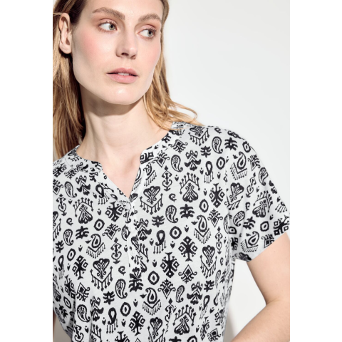 Cecil Női Póló 321526-33474. Színe: vanilla white Art. Cikkszám: B32152633474Ez a CECIL női póló vonzó nyomtatással rendelkezik. Bájos, rövid ujjú póló, hasított, kerek nyakkivágással, amelyet gombos záródással díszítettek. A díszes minta elegáns jelleget kölcsönöz az ingnek. Könnyű pamut-modál anyagból készült, így ideális nyári darab a stílusos és kényelmes megjelenéshez. 321526-33474