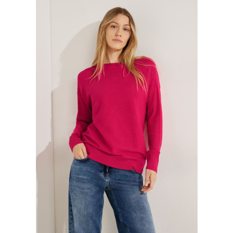 Cecil Női Pulóver 302446-15271. Színe: cosy coral melange Art. Cikkszám: B30244614929Stílusos mix! Ez a női kötött pulóver a CECIL-től bateau nyakkivágással, nagyszerű chunky kötött megjelenéssel. A pulóver kényelmes viszkózkeverékből készült, széles bordás mandzsettával, és például ingblúzzal kombinálható. 302446-15271