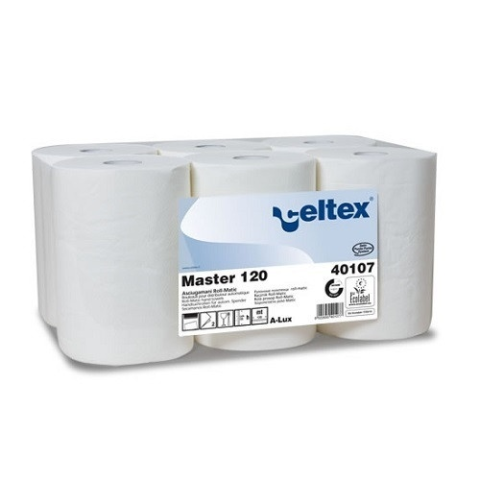 Tekercses kéztörlő papír Master 120 - tekercses kéztörlő papír - automata adagolóban használható - 100% cellulóz - fehér - 2 x 20g réteg - 120 méter/tekercs - 16 cm átmérőjű, 20.3 cm széles - 6 tekercs/zsugor - 72 zsugor / raklap - Celtex MASTER adago