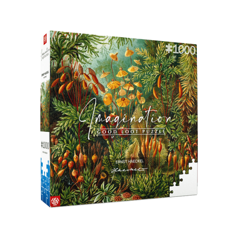 Puzzle Ernst Haeckel "Muscinae" illusztrációja alapján, 1000 darabos. Ernst Haeckel (1834-1919) egy német biológus, evolucionista, művész, filozófus és orvos volt, aki annak szentelte az életét, hogy kutassa a flórát és faunát a legmagasabb hegycsúcsoktól, az óceán legmélyebb pontjáig. Többszáz részletes rajzot, akvarellt és vázlatot készített a megállapításairól, melyeket nagy sikerrel övezve publikált. Haeckel munkái a grafikai precizitásuktól és elképesz