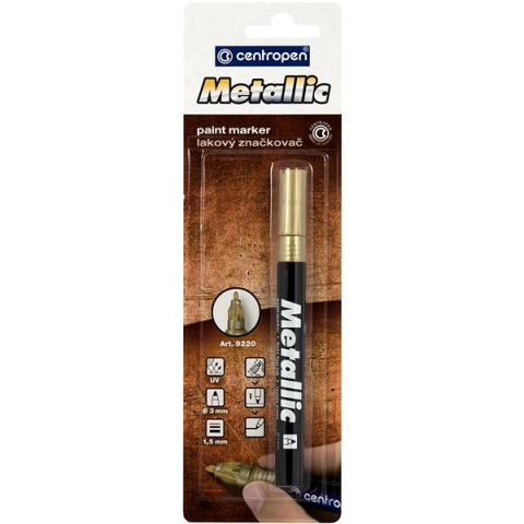 Marker - lakk, használható porcelán, papír, kő, fa, műanyag, kerámia, fém és beton felületeken, metálos, vízálló, hegy formája kerek, 1,5 mm vonalvastagság, kerek markolat, A jól kihasználható CENTROPEN 9220 - lakk, 1,5mm, arany termék leglényegesebb tulajdonságai A jól kihasználható Centropen marker nélkülözhetetlen, ha írni kell vagy rajzolni szeretnél Kerek a forma ké